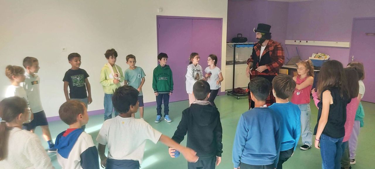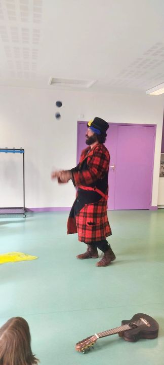 Le mardi 16 septembre, les enfants des trois classes bilingues ont beaucoup ri devant les sketchs de Lomig le clown, alias Guillaume Tiery. Il est intervenu à l'école pour présenter aux enfants des danses et des chants qui seront pratiqués lors du spectacle "Ar lagad bleiz " (l'arc-en-ciel) du groupe Spontus le vendredi 17 octobre. Les musiciens feront participer tous les enfants des classes bilingues du Pays d'Auray dans un fest-deiz original. Cette journée fait partie de la programmation d'Un automne autrement (Bro Alré gouil bamdé), organisé par Ti Douar Alre.